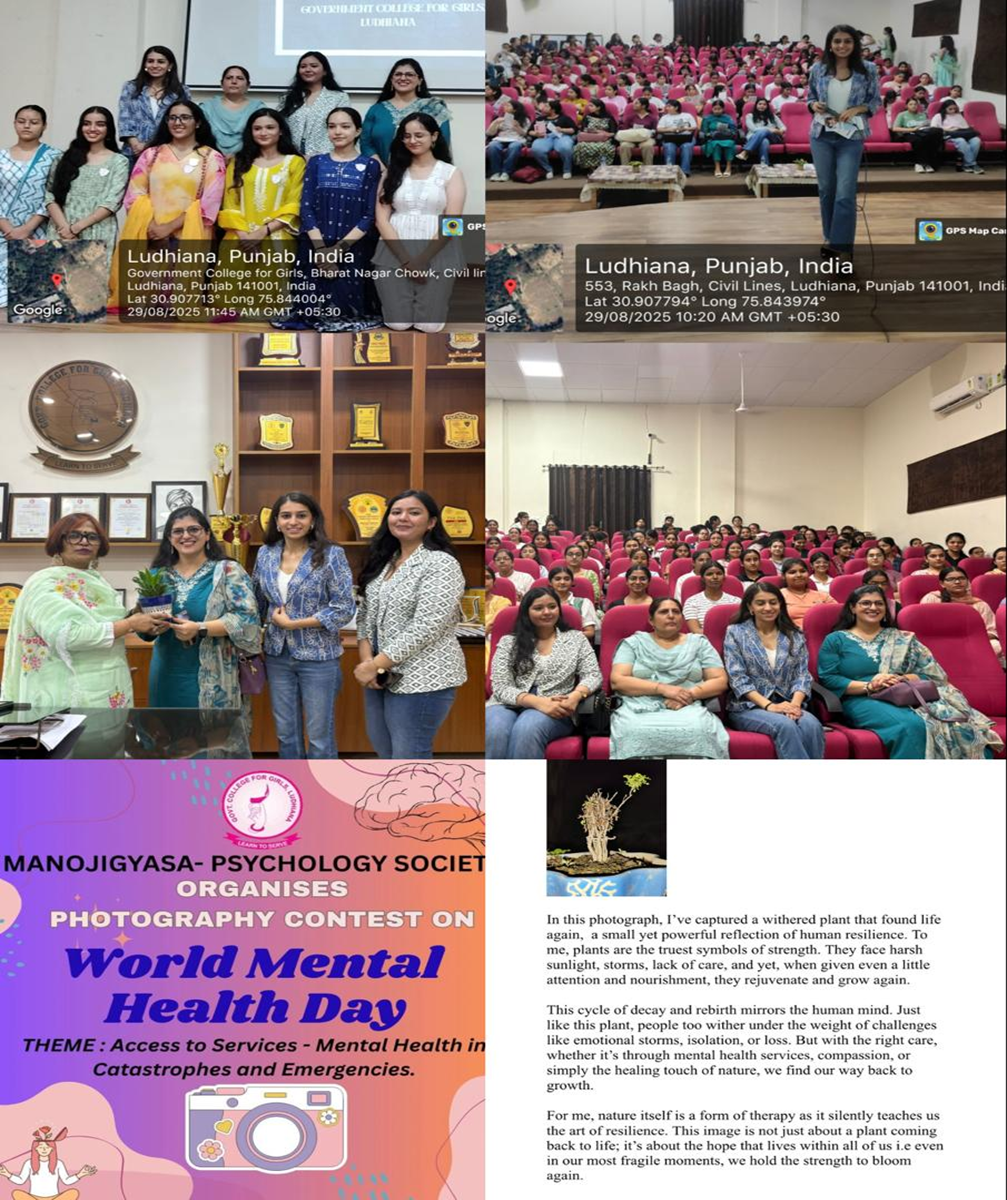 World Mental Health Day 2025 On the occasion of World Mental Health Day 2025 the psychology society organized a Photography Contest on the topic, “Through my Lens: Coping: in Calamities” based on the theme “Access to Services- Mental Health in Catastrophes and Emergencies”. The event aimed to promote mental health awareness through creative visual expression. Students captured photographs that reflected emotions, resilience, and the importance of mental well-being during time of crisis. The entries were evaluated for originality, relevance to the theme, and overall impact. |