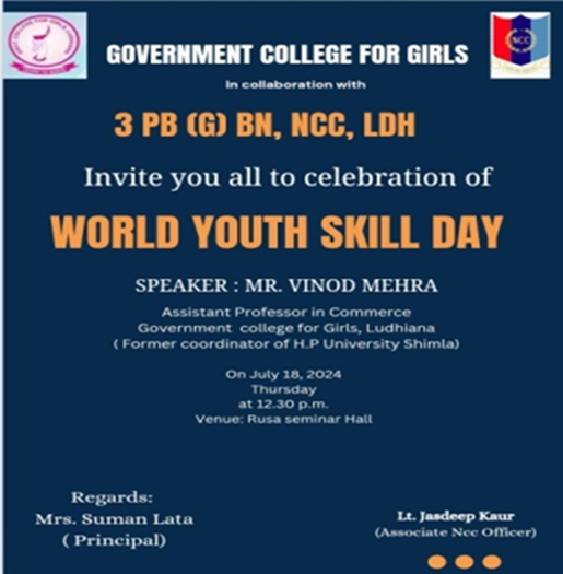 Government college for girls in collaboration with 3 PB (G) BN NCC Ludhiana organised a one day seminar on world youth skills day. The event was held in RUSA Seminar Hall. The keynote speaker for the seminar was Mr. Vinod Mehra, Assistant Professor in Commerce, who delivered an insightful session. He highlighted the importance of skill development in today’s dynamic world and share valuable insights on the Pradhan Mantri Vishwakrama Yojana( PM VIKAS), a flagship intiative aimed at promoting traditional skill and craftsmanship. |