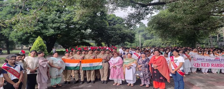 A campaign initiated by Government of India on the eve of 75th Independence day of India "Har ghar Tiranga Event" was organised at GCG's RUSA Seminar Hall under the aegis"Azadi ka Amrit Mahotsav" where NCC cadets particpated in various activities such as declamation and patriotic group song. It was collaborated with NSS and Red Ribbon Society of the college. The idea behind the initiative was to invoke the feeling of patriotism in the hearts of youth and to promote the awareness about Indian National Flag. |